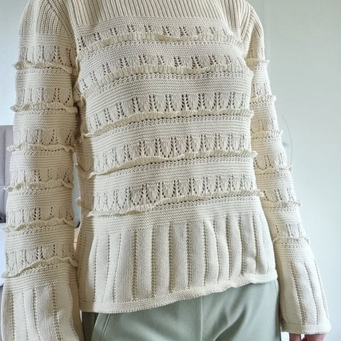 Strikket trøje, ribstrikket halsudskæring. Nedsænkede skuldre. Ribstrikkede kanter ved ærmeafslutningerne.