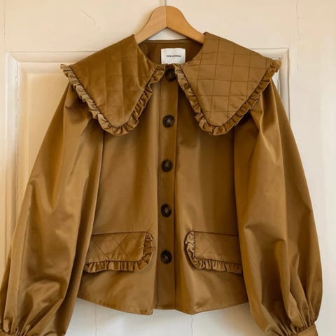 Jakken har knapper og lommer foran, og er velegnet til køligere vejr.