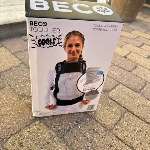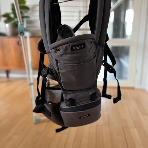 Barnet støttes let under numsen, mens det bliver båret i selen. Købt på en udlandsrejse.