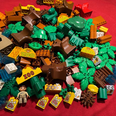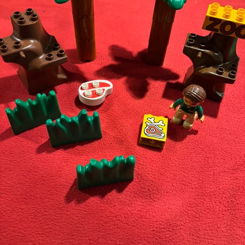 LEGO DUPLO - zoologisk have hvor du kan sætte dine egne løver, aber, giraffer ind. Sættet indeholder zoo dyrepasser, træer til aber 2 palmer, buske og kød til løverne.