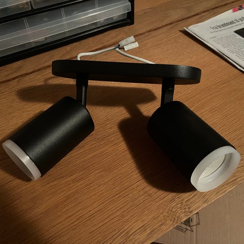Der er sort stofledning på og der medfølger Philips Hue e60 farvepærer.