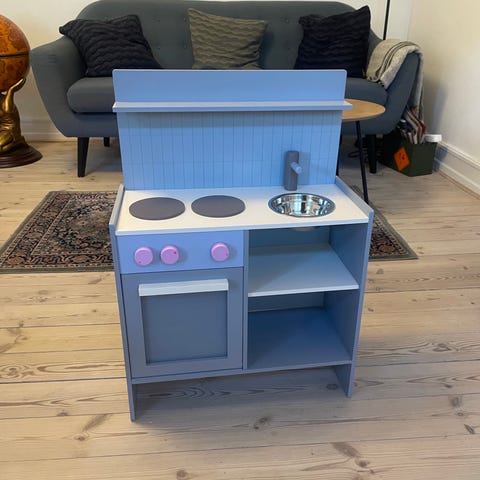 Vilac Depuis 1911 legekøkken i træ med ovn, kogeplader og vask. Køkkenet har grønne ben og naturligt træfarvet overflade med enkelte og farvede detaljer. H 80 cm x B 54 cm x L 33 cm. Mad i træ medfølger. God kvalitet. Fuld funktionel. Kan afhentes på Frb. C.