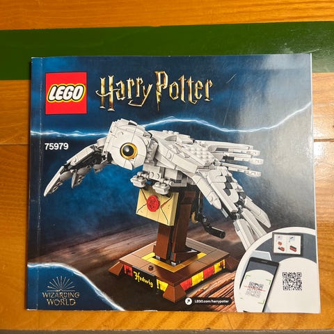 LEGO Harry Potter 76425 model af Hedwig. Sættet inkluderer en hvid ugle med bevægelige vinger og et tilhørende grønt stativ med 'Privet Drive' skilt. Modellen leveres med en lille skattekiste med tilbehør og en instruktion manual.