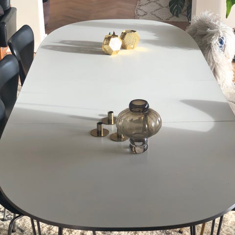 Fint hvidt laminat spisebord med 2 tillægsplader. Designet er kraftigt Inspireret af Piet Hein bordet. Fremstår med små hakker som det ses på et af billederne.