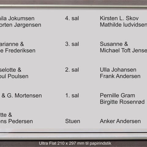 Ultra Flat vægskilt i aluminiumsprofil med alu.kant. Med plexi-front for indsæt / udskift af papirprint som du selv laver.