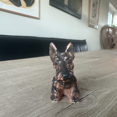 Original Michael Andersen figur af to hunde i grøn og rød glasur. Figuren viser to legende hunde i en sammenflettet position. Overfladen har en sprækket glasur, hvilket giver et smukt udseende. Figuren er detaljeret med tydelig tekstur.