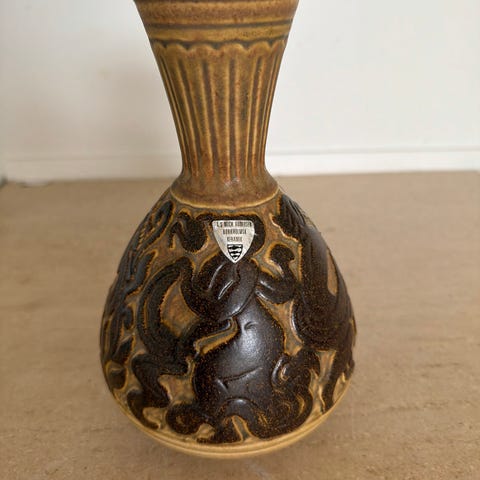 Der er bare noget der gør , at man ved den er noget helt for sig selv, bare formen og så de smukke natur farver , check også de sarte riller , helt i mat, det er en HÖGANÄS vase, men ham der har bag vasen er OVE THORNBLAD, som ved hvad han laver. Super stand , har en micro født brændings fejl , ( se billeder ) , mål 17,5 x 15 cm , Søgeord! Samler, stentøj , tidsløs, keramik, made in Sweden, samleobjekt, indbo, indretning, pynt, Deco , dekoration. SENDER KUN MED DAO ELLER AFHENTNING.