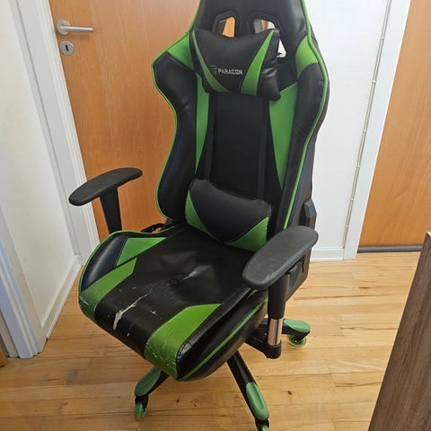 Paracon Gaming Stol i sort kunstlæder med ergonomisk design. Stolen har justerbare armlæn og inkluderer en nakkepude for ekstra støtte. Egnet til brug ved skrivebord eller gaming setup.