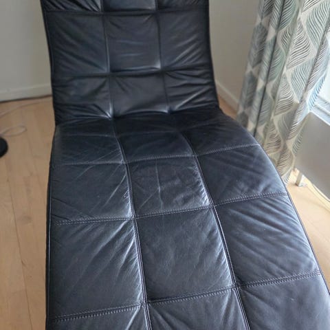 Chaiselong stol i sort læder med metal stel, ingen slidmærker i læderet, kan lægges helt ned.