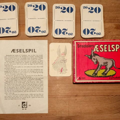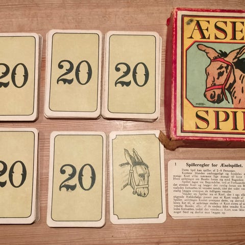 Gammelt æselspil - nok fra 40-50erne - består af 4 x 1-20 kort + æsel og spilleregler.