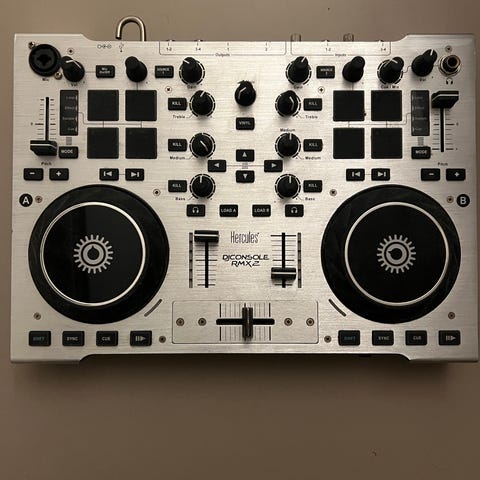 Pioneer DDJ-ERGO DJ controller med forskellige knapper, drejehjul og skydeknapper til musikstyring. Enheden er designet til DJ-brug og leveres med et robust kuffertlignende etui til transport og beskyttelse.