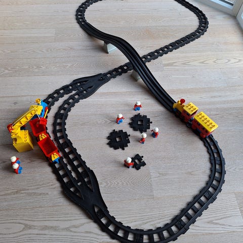 Lego Duplo 2 stk elektriske tog med vogne og masser togskinner, broer osv.