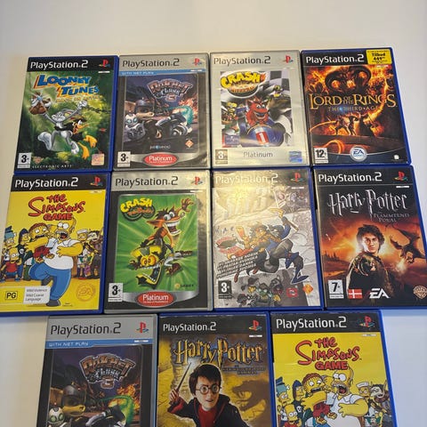 Playstation 2 spilpakke bestående af 12 forskellige spil i original emballage. Spiludvalget inkluderer forskellige genrer og titler til Playstation 2 konsollen. Spilene leveres med originale covere og diske.