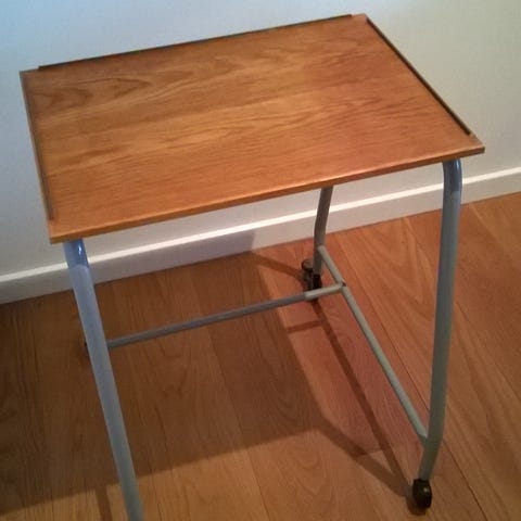 Fint lille vintagebord fra Møller & Landschultz Papirhandel og bogtrykkeri. Kender ikke alderen. Klapper i side kan slåes ud og hjulene fungerer fint.