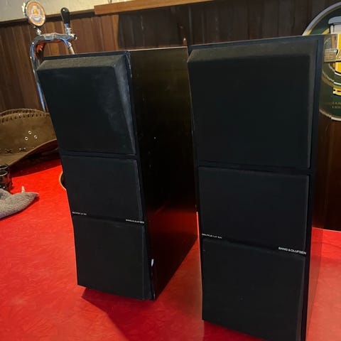 Bang & Olufsen Beovox CX 100 højttalere med et karakteristisk og stilfuldt design. Højttalerne har et sort stofbetræk foran og et børstet aluminiumskabinet. Basenhederne trænger til nye kantophæng.
