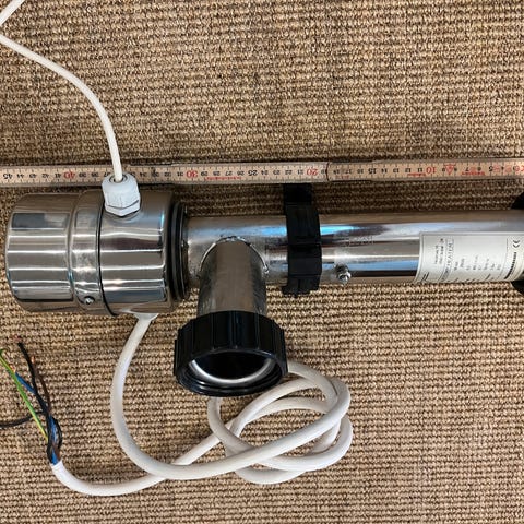 LX Flow Type Heater varmelegeme med en effekt på 2000W og driftsspænding på 220V. Varmelegemet er fremstillet i rustfrit stål og har en tilslutningsledning med stik. Produktet anvendes til opvarmning i forskellige industrielle og tekniske sammenhænge.