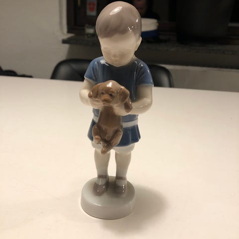 Bing & Grøndahl figur af en dreng iført blå bukser og hvid skjorte. Figuren er lavet af porcelæn og viser drengen i en siddende position.