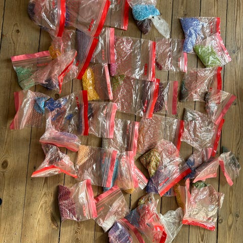 • Meget store mængder perler på snor (perle-look / glas / plast)