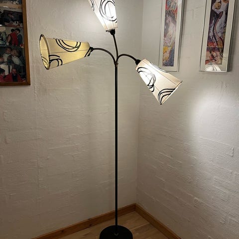 Gulvlampe med beigefarvet skærm med matchende messingfarvet kant forneden. Højde ca. 148 cm. Skærm diameter på bredeste sted ca. 40 cm. Lampen har en justerbar arm og en rund fod i messingfarvet metal. Velegnet til brug som læselampe eller stemningsfuld belysning i stuen eller kontoret.