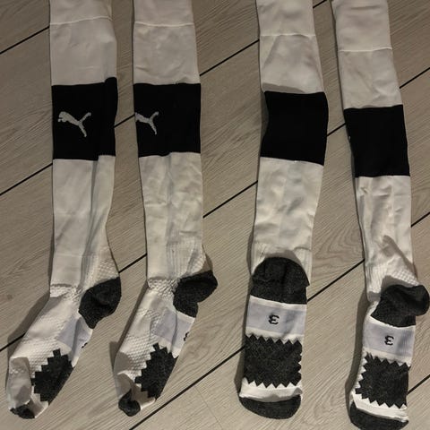 Puma 4 par fodboldstrømper med farverne sort og hvid. Strømperne har Puma-logo på.