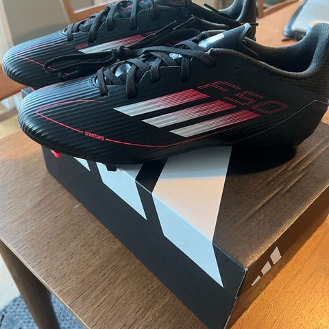Adidas F50 FG fodboldstøvler i størrelse 45,5. Støvlerne er gulneon med blå detaljer og har en FG-sål til brug på fast græs. Materialet er syntetisk, og de er designet til fodboldspil.