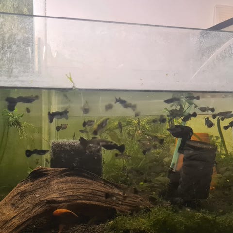 Jeg har en hel masse guppy-unger af egen avl, som søger nyt hjem. Hunnerne er sølv på undersiden og brun/beige, og hannerne er ligeledes sølvgrå, men orange på oversiden og på den flotte lange hale. De er meget sociale. Jeg har næsten kun hunner, de kommer til gengæld i flere størrelser. 10 kr. stykket og 10 for 50.