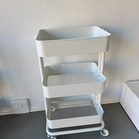 Rullebord fra Silvan, som ligner Ikea RÅSKOG rullebord, , sort metal med hjul, 3 hylder, til køkken, på efterskolen, i krearummet mv, i god stand nypris 299kr, sælges for 125kr, kan evt. leveres