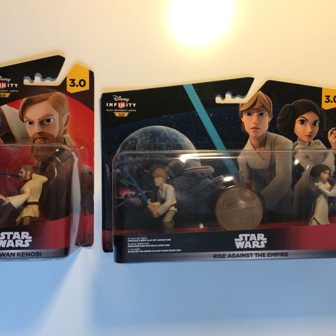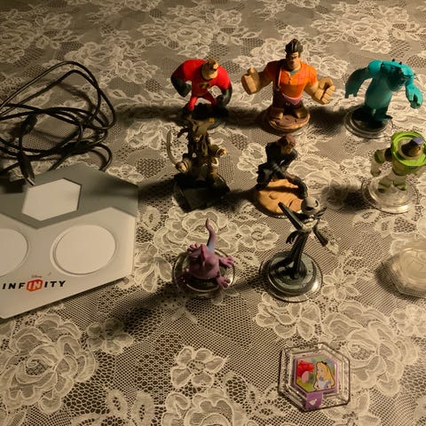 Disney Infinity 3.0 startpakke med base og seks figurer. Inkluderer en hexagonal base med tilslutningskabel samt figurer af forskellige Disney-karakterer. Figurenes stande er i forskellige farver og former, og de er designet til brug med Disney Infinity 3.0 spilplatform.