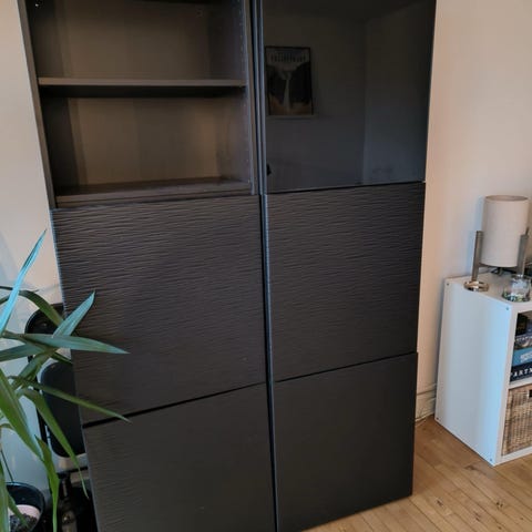 Super flotte IKEA Bestå garderobeskabe med flere hylder, tøjstang og skabsdøre i hvid og mørk beige farve. De små skabe har vi haft over de høje så de går fra gulv til loft. De små måler 40 cm i højden, bredde og dybde er det samme. Lukkes med tryk/fjeder system. Ingen ridser på låger. Der er 4 små huller øverst på de høje på siderne, da de har været skruet sammen. Prisen er for det hele, både høje skabe og de to små, hylder og bøjlestang.