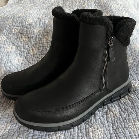 Skechers Vinterstøvler i størrelse 40, sort farve. Støvlerne har en varm foring og snørebånd, designet til at holde fødderne varme i vintervejr.