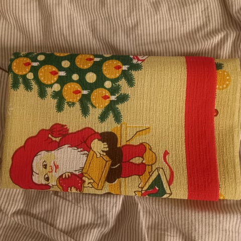 Juledug brugt få gange, flot og velholdt, strygefri, mål 195 cm L, 142 cm B, kommer fra dyre og rygefrit hjem. Nu nedsat til 75kr. Kan hentes så man spare forsendelse