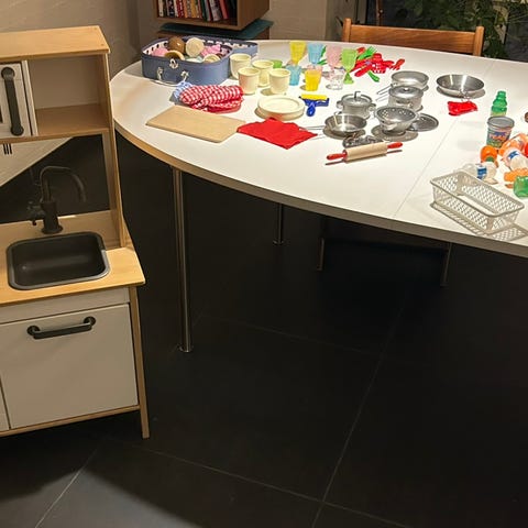 Legekøkken fra IKEA i fin stand (lampe i komfur virker dog ikke). Legemad, service, pander og grydeskeer mm. medfølger (sælges også seperat). Pris i alt 400 kr.