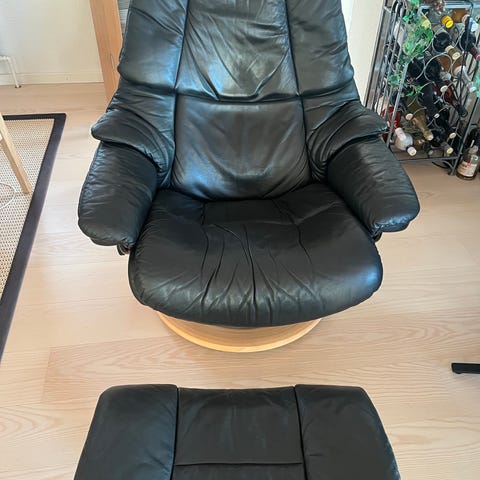 2 Stressless Wing lænestole med skamler, kvadratisk bord og lænestol