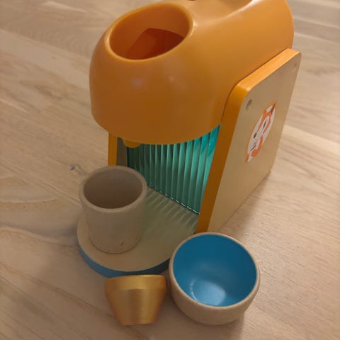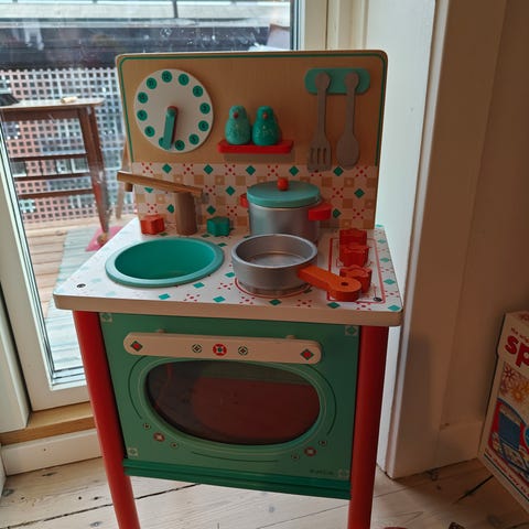 Djeco mini køkken/pandekagebod i rigtig fin stand. Æsken er udformet som et kogeblus. Der medfølger pande (træ/plastic), 4 pandekager (filt), med hver sin topping (træ), tallerken og menukort (træ). Perfekt til den lille kok.