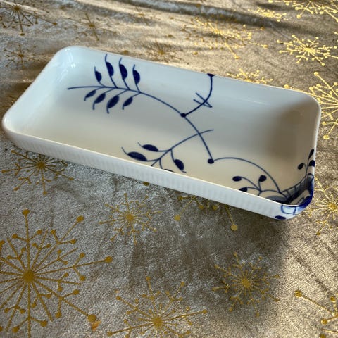 Royal Copenhagen mega Musselmalet Riflet fad med blå håndmalet mønster på hvid porcelæn. Fadet har en oval form og måler cirka 38 cm i længden. Designet er klassisk og kan anvendes til servering af mad.