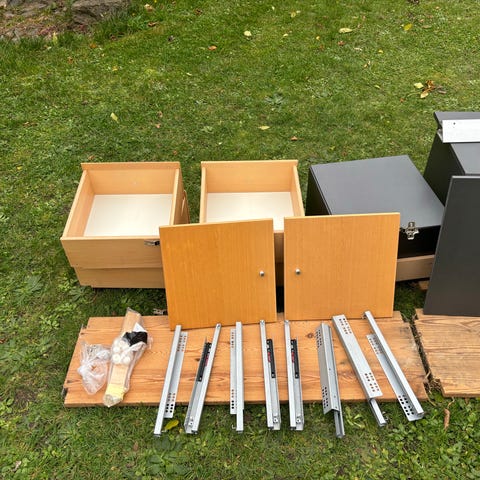 Tre moduler i grå. Bredde ca 70 cm pr modul.