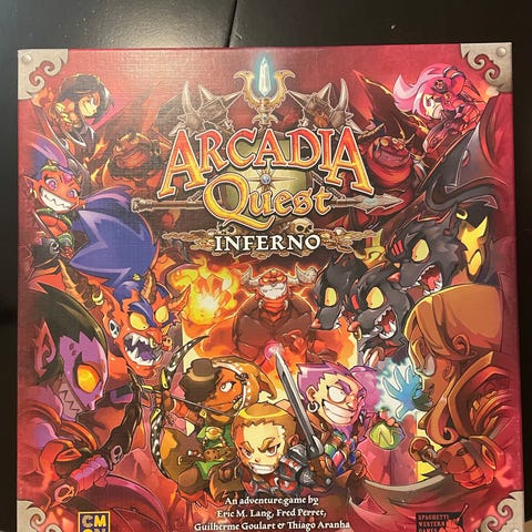 CMON Arcadia Quest brætspil med flere udvidelser inklusive The Guild Box, The Blood Dragon og Pets. Spillet indeholder forskellige karakterer og monstre i en fantasy-verden, designet til strategisk og taktisk spiloplevelse for flere spillere. Spillet og udvidelserne er aldrig brugt og kommer fra et ikke ryger hjem dog er nogle få pets figurer malet