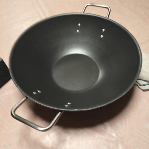 Eva Solo wokpande i rustfri stål med to håndtag. Panden har en rund form og er egnet til tilberedning af forskellige retter, hvor der kræves høj varme og jævn varmefordeling.