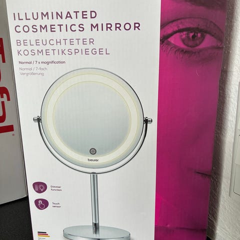 Det nye makeupspejl, BS 45, fra Beurer er designet med en ekstra stor spejlflade og et skarpt LED lys i perfekt farvetemperatur til makeuplægning. Det klare lys gør det også nemmere at se de små hår i forbindelse med plukning af øjenbryn. Spejlets diameter måler 17,5 cm.