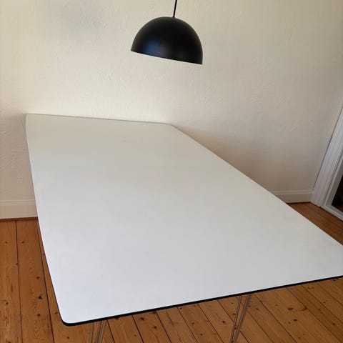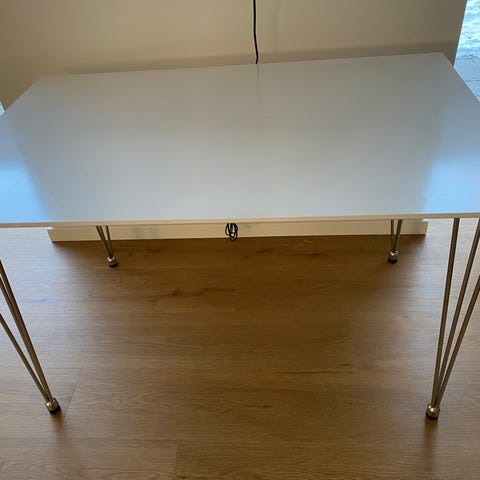Bord med hvid bordplade og metalben. Måler 120x72 cm. Velegnet til køkkenet eller kontor. Kan bruges med forskellige stole.