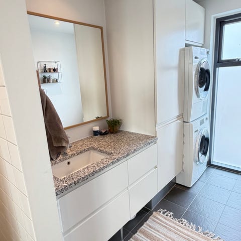 Badeværelsesmodulerne er samme størrelse som køkkenmoduler og kan derfor sagtens bruges i enten et køkken eller bryggers.