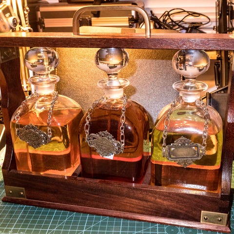 Tantalus i messing m. originale karafler(uden halsskilte og indhold) og uorginal hængelås.