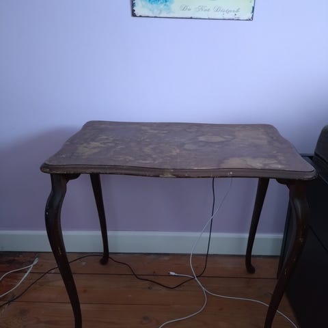Gammelt ståbord i træ. Foden skal slibes til da den bur så det vipper en smule. Mene ellers I rigtig pæn stand.