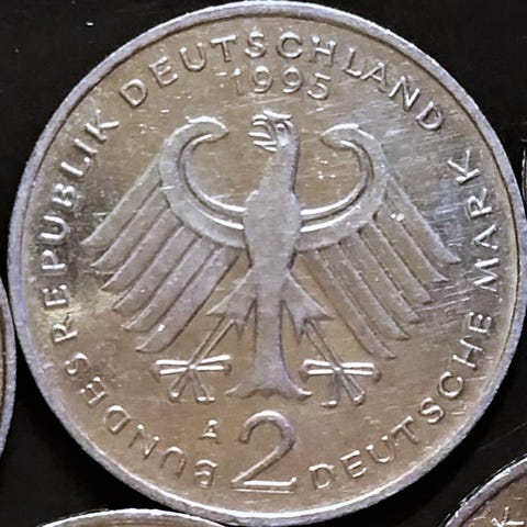 TYSKLAND GERMANY DEUTSCHLAND BEDRE ÅR! 2 DEUTSCHE MARK 1996D 2 DM 1996 D !! Ludwig Erhard SUPERFLOT med møntskær TÆT PÅ UNC. FRA RULLEN. 2DM fra 1996 sælger mellem 4 - 7 euro /Stk! (30-50DKK)! Porto 25kr. Op til 100gram! 15Kr/Stk. eller 10kr./Stk. hvis du køber 5 eller flere! 2 Deutsche Mark 1988 - 2001 (Ludwig Erhard), Circulating commemorative coin : 40 Years of Deutsche Mark, Copper-nickel clad nickel • 7 g • ø 26.75 mm, KM#170