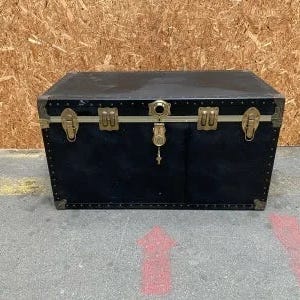 Stor gammel kuffert,beklædt med lærred,trælister og messingbeslag.