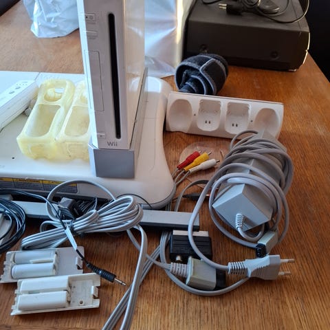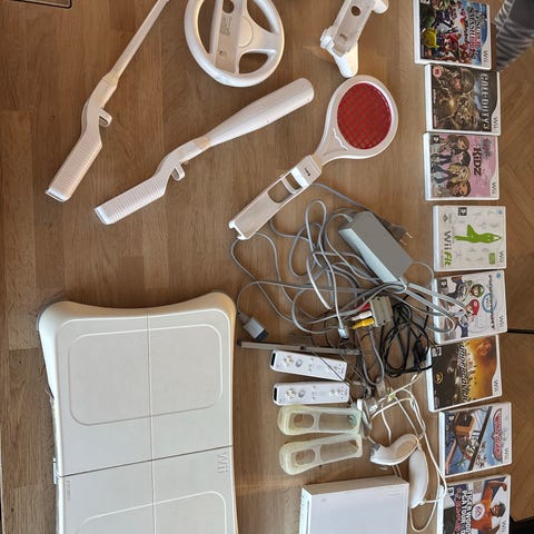 Nintendo Wii konsol med flere spil og tilbehør. Inkluderer forskellige spil i original emballage samt forskellige typer controllere og tilbehør til spiloplevelsen. Passer til Nintendo Wii system (kun 1 rat følger med). Samlet pris.