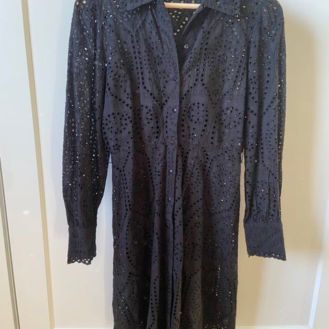 YAS Hverdagskjole i størrelse M til kvinder. Falder fint. Kjolen er sort med råhvide striber og lavet af viskose. Den har knapper foran og 3/4 ærmer. Materialet gør kjolen behagelig at have på til hverdagsbrug.