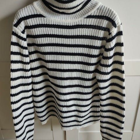 Rigtig lækker tyk striktrøje i lys grå. Str S. Med rund hals. Er nærmest ikke brugt. Mål fra skulder til skulder ca 46 cm, skulder til liv ca 54 cm og fra armhule til liv ca 36 cm.
