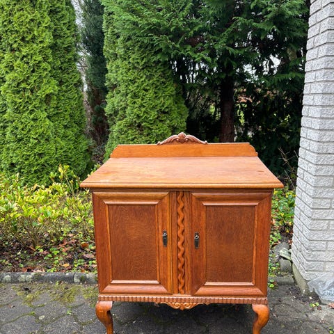 Antik skænk fremstillet i træ med dekorative udskæringer. Skænken er 100 gammel og har flere opbevaringsrum inklusive skabe og hylder, der kan bruges til opbevaring af diverse genstande. Møblet har en klassisk stil og passer til opbevaring i stue eller spisestue.