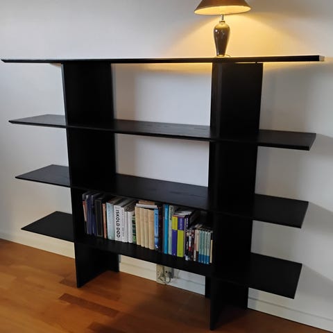 Mega fed og velholdt reol fra IKEA i egefiner. De forskudte hylder giver en helt særlig effekt og designet er virkelig lækkert og gennemført.
